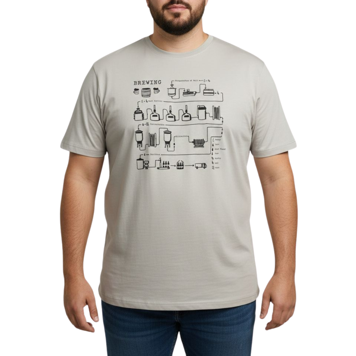Camiseta masculina plus size com estampa frontal em estilo ilustrado técnico, formando um visual moderno e diferenciado. O desenho apresenta elementos gráficos organizados em formato de diagrama, trazendo personalidade à peça.